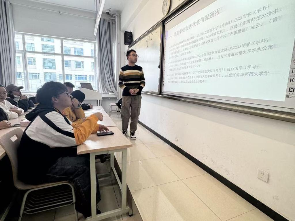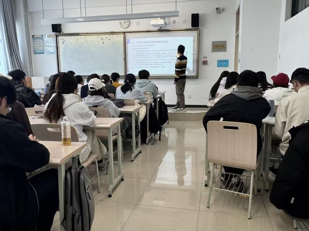本次例会以实用、落地为导向,袁老师通过案例讲解、互动交流、具体讲解相结合的方式,确保同学们准确掌握会议内容。一是,袁老师以“通报具体数据+剖析典型案例”的方式展开宿舍安全教育。明确近期学校、学院宿舍检查过程中发现的典型问题(如存放违规电器、卫生不达标等),再结合处分实例强调违纪违规的严重后果;二是,袁老师将前期检查出的宿舍相关问题整理为“问题清单”,逐项明确宿舍长责任,如卫生整改需“定人定时”、安全排查要“每日自查”;三是,袁老师对《学生手册》中学生违纪处分办法、评奖评优细则、请销假制度等内容进行详细解读。